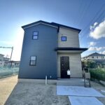 切妻屋根とネイビーブルーの外壁が特徴です。4LDK、耐震等級3と品質に優れ、浴室暖房乾燥機とランドリーパイプを装備、家事の負担を軽減します。広めのルーフバルコニーもあり、コストパフォーマンスが高いお家です。